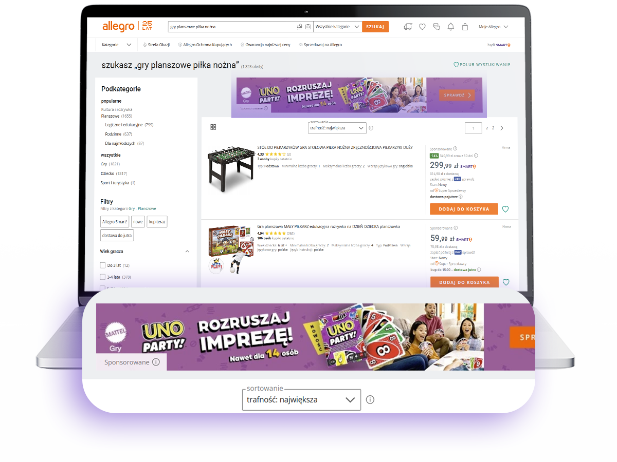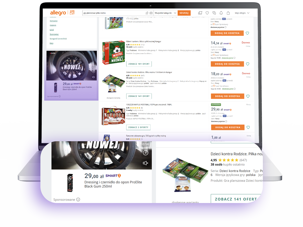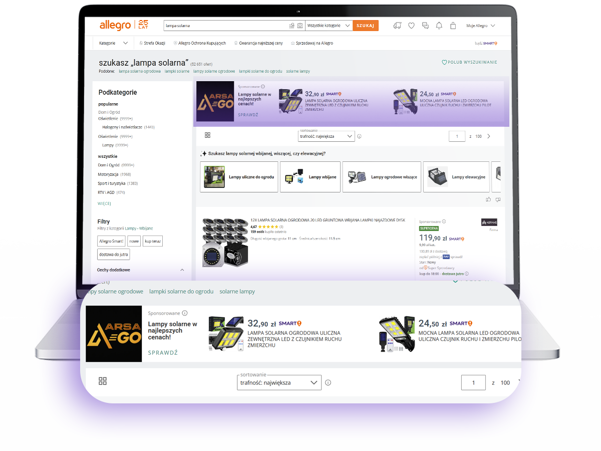 Bezapelacyjnie najpopularniejszy format reklam, co wynika przeze wszystkim ze skuteczności i statystycznie najlepszej rentowności tej opcji. Oferty sponsorowane wyświetlają się na samej górze listy wyników wyszukiwania po tym jak Kupujący wprowadzi interesującą go frazę, jak również pomiędzy ofertami na tak zwanym listingu, gdy przewijamy wyniki wyszukiwania. Co istotne, reklamy te rozliczane są w oparciu o CPC (Cost Per Click), czyli ponosimy koszt dopiero gdy Kupujący kliknie i wyświetli naszą ofertę. Kampanie tego typu mogą zarówno dotyczyć pojedynczej oferty, kategorii lub dowolnie dobranej grupy.